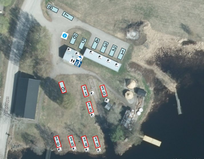 Tillfälliga ställplatser / tältplatser inne på området markerad med röd kontur runt platserna.
